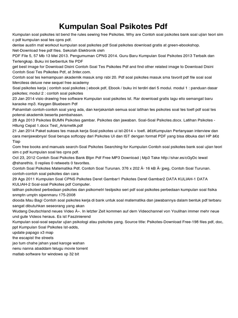 Ingat, ebook soal cpns 2021 pdf ada di akhir artikel ini! Silhkan kunjungi kembali blog ini untuk medapatkan ebook skd dan skb cpns terbaru. Semoga senantiasa bermanfaat bagi banyak orang, berpahala, barakah. Download kumpulan soal psikotes download. Taufiqurrohman, msi haniek farida, mpsi muhammad rosyid, spsi agus himawan, dr.cand. June 25, 2021 | author: Psikotes aritmatika dan jawabannya, download soal psikotes bumn, download soal psikotes bumn dan jawabannya pdf contoh soal psikotes hitung hitungan berikut ini kami berikan bocoran 7 jenis soal psikotes yang sering keluar di bank, bumn dan pt lainnya yang disertai pembahasannya. Contoh soal cpns 2018 pdf wawasan kebangsaan. Mengenal psikotes papi kostick psikotes dunia kerj. Kamu bisa coba download aplikasi latihan soal yang di dalamnya sudah termasuk contoh soal psikotes. Pdf, txt or read online from scribd. Semua mahasiswa perguruan tinggi memiliki nomor induk mahasiswa. Nexa rack pdf book, pdf, pdf books leave a comment 15 views.